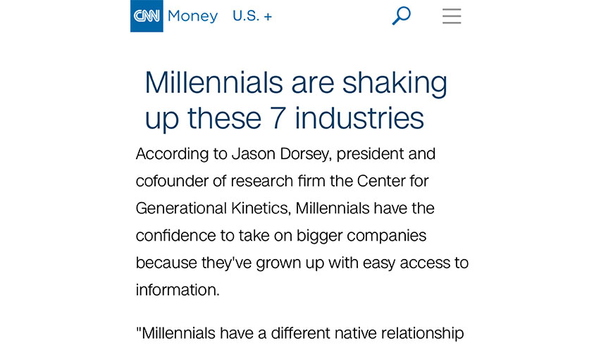 Jason Dorsey, President, Co-Founder, and Millennials researcher and expert at The Center for Generational Kinetics was quoted extensively in the CNN article.