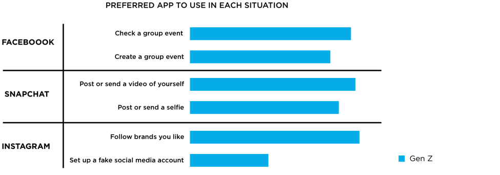However, Gen Z is very particular about which platform they use for specific interactions and outcomes. For instance, Gen Z uses Facebook to create or check a group event, Snapchat to post or send a video or a selfie, and Instagram to follow brands.