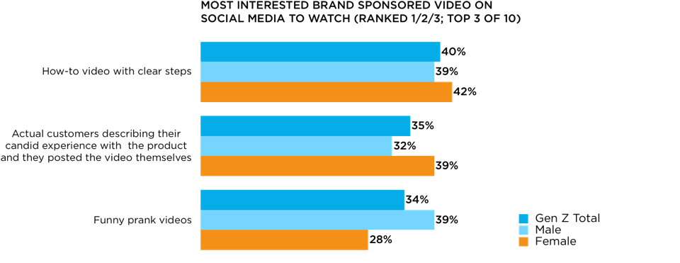 Online videos are a consistent resource for this generation. When we asked Gen Z which type of brand sponsored videos preferred, how-to videos, customer testimonials, and funny prank videos were the favorites.